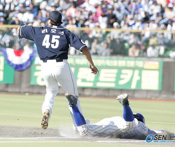 15일 대구 시민운동장서 벌어진 삼성 라이온즈와 두산 베어스의 한국시리즈 1차전 0-2로 뒤진 삼성의 3회말 1사 2,3루서 조동찬이 1루수 앞으로 높게 튄 내야 땅볼을 치고 두산 투수 리오스의 늦은 1루 커버를 틈 타 세이프되고 있다. /대구=손용호 기자 spjj@osen.co.kr [Copyright ⓒ OSEN(www.osen.co.kr) 무단전재 및 재배포 금지]