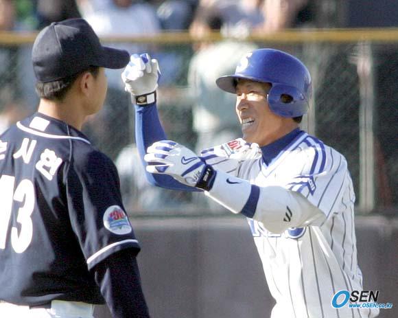 15일 대구 시민운동장서 벌어진 삼성 라이온즈와 두산 베어스의 한국시리즈 1차전 2-2 동점이던 삼성의 5회말 1사 3루서 스퀴즈 번트를 시도하다 부상을 당한 박종호를 대신해 볼카운트 2-2서 기용된 김재걸이 역전 2루타를 치고 나간 뒤 2루에서 환호하고 있다./대구=손용호 기자 spjj@osen.co.kr [Copyright ⓒ OSEN(www.osen.co.kr) 무단전재 및 재배포 금지]