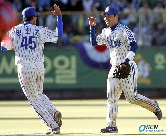 15일 대구 시민운동장서 벌어진 삼성 라이온즈와 두산 베어스의 한국시리즈 1차전 두산 6회초 1사 1루서 홍성흔의 안타성 땅볼 타구를 다이빙 캐치로 잡아 병살로 처리한 박진만(오른쪽)과 삼성 두 번째 투수 권오준이 하이파이브를 하고 있다./대구=손용호 기자 spjj@osen.co.kr [Copyright ⓒ OSEN(www.osen.co.kr) 무단전재 및 재배포 금지]