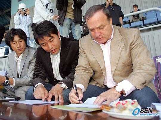 16일 부천 SK와 FC 서울의 경기가 벌어진 부천 종합운동장을 찾은 딕 아드보카트 국가대표팀 감독이 통역 박일기 씨의 도움을 받으며 선수 명단을 체크하고 있다./부천=주지영 기자 jj0jj0@osen.co.kr [Copyright ⓒ OSEN(www.osen.co.kr) 무단전재 및 재배포 금지]