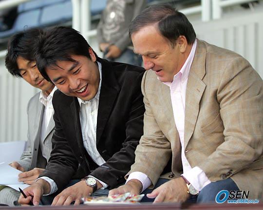 16일 부천 SK와 FC 서울의 경기를 관전하기 위해 부천 종합운동장을 찾은 딕 아드보카트 국가대표팀 신임 감독이 통역 박일기 씨와 함께 웃으며 이야기하고 있다. /부천=주지영 기자 jj0jj0@osen.co.kr [Copyright ⓒ OSEN(www.osen.co.kr) 무단전재 및 재배포 금지]