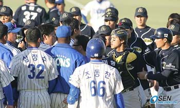 16일 대구구장에서 열린 삼성과 두산의 2005프로야구 한국시리즈 2차전 도중 흥분한 양팀 선수들이 모두 그라운드에 몰려 나오는 일촉즉발의 상황이 연출됐다. 0-1로 뒤지던 삼성이 동점을 만든 7회말 공격, 2사 1루에서 조동찬이 친 타구에 대한 심판의 파울 콜이 늦어지는 바람에 1루 주자 김재걸이 홈까지 들어오고 이를 막던 두산 포수 홍성흔과 가벼운 말싸움이 벌어졌다. 두산 1루수 장원진이 이를 말리러 와서 김재걸을 가볍게 떼어놓다가 김재걸과 장원진의 입씨름으로 변했다. 순간 양팀 선수들이 덕아웃에서 뛰쳐나와 그라운드 한가운데로 몰려나오면서 일순 집단 힘겨루기로 상황이 급변했다. 일부 관중들까지 물병 등을 던지며 가세, 경기가 2~3분 가량 중단됐다. 심판진이 양팀 선수단 가운데를 막으면서 진정시켰고 양팀 선수들도 분위기를 가라앉히고 물러나 몸싸움은 벌어지지 않았다. 그만큼 양팀 선수들이 시종 팽팽한 경기를 펼치면서 신경이 극도로 예민해졌음을 알 수 있는 한 장면이었다. 대구=박선양 기자 sun@osen.co.kr [Copyright ⓒ OSEN(www.osen.co.kr) 무단전재 및 재배포 금지]