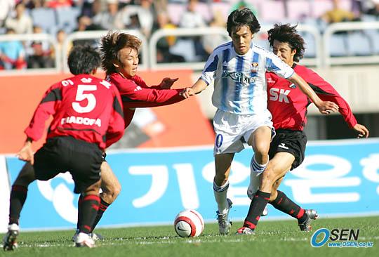 16일 부천 종합운동장에서 벌어진 부천 SK와 FC 서울의 경기 후반 서울의 박주영이 드리블을 하자 부천의 조용형(왼쪽에서 두 번째) 등 수비수들이 에워싸고 있다./부천=주지영 기자 jj0jj0@osen.co.kr [Copyright ⓒ OSEN(www.osen.co.kr) 무단전재 및 재배포 금지]