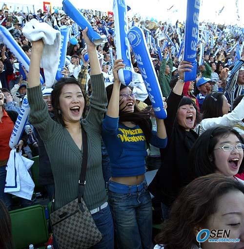 16일 대구구장에서 열린 한국시리즈 2차전 삼성 라이온즈와 두산 베어스의 경기는 삼성이 12회말에 터진 김종훈의 끝내기 안타로 3-2로 역전승을 거두었다. 9회말 김대익의 극적인 동점홈런이 터지자 관중석의 팬들이 열광하고 있다. /대구=손용호 기자 spjj@osen.co.kr [Copyright ⓒ OSEN(www.osen.co.kr) 무단전재 및 재배포 금지]