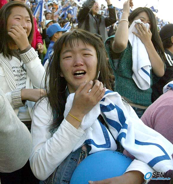 16일 대구구장에서 열린 한국시리즈 2차전 삼성 라이온즈와 두산 베어스의 경기는 삼성이 12회말에 터진 김종훈의 끝내기 안타로 3-2로 역전승을 거두었다. 9회말 김대익의 극적인 동점홈런이 터지자 여성팬이 기쁨에 겨운 나머지 눈물을 흘리고 있다. /대구=손용호 기자 spjj@osen.co.kr [Copyright ⓒ OSEN(www.osen.co.kr) 무단전재 및 재배포 금지]