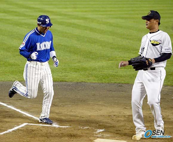 18일 잠실구장에서 벌어진 두산 베어스와 삼성 라이온즈의 한국시리즈 3차전 삼성의 2회초 2사 1,3루서 두산 선발 투수 박명환의 폭투 때 3루주자 박진만이 홈을 밟고 있다. 삼성은 볼넷으로 진루한 박진만이 2사 1,2루에서 3루를 훔친 뒤 폭투로 안타 하나 없이 가볍게 1점을 선취했다./잠실=손용호 기자spjj@osen.co.kr [Copyright ⓒ OSEN(www.osen.co.kr) 무단전재 및 재배포 금지]