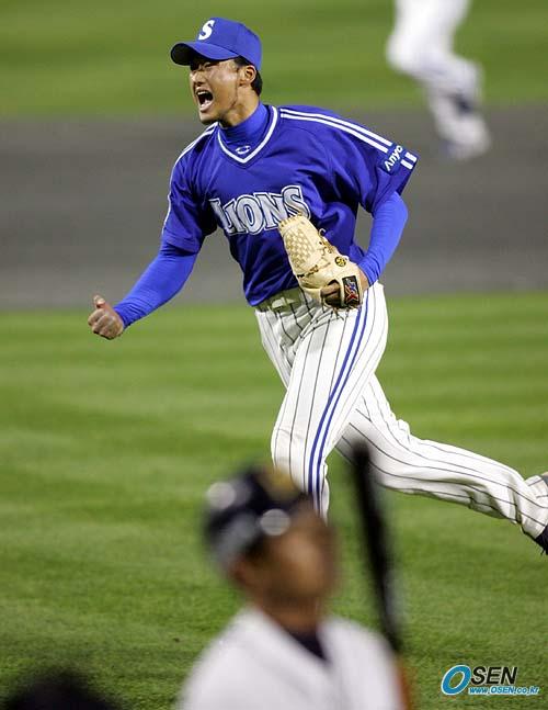 18일 잠실 구장에서 벌어진 두산 베어스와 삼성 라이온즈의 한국시리즈 3차전 두산의 6회말 2사 2,3루서 삼성 두 번째 투수 권오준이 안경현을 삼진으로 잡고 환호하는 반면 삼진을 당한 안경현은 방망이를 쳐다보며 아쉬워 하고 있다./잠실=손용호 기자 spjj@osen.co.kr [Copyright ⓒ OSEN(www.osen.co.kr) 무단전재 및 재배포 금지]