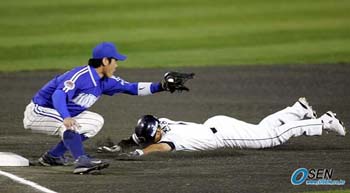 이번 한국시리즈를 '걸사마 시리즈'로 만든 삼성 김재걸(33). 1차전 대타 결승타에 이어 2차전 끝내기 득점까지 삼성의 연승은 김재걸의 방망이와 발에서 나왔다. 18일 잠실구장으로 옮겨 펼쳐진 3차전. 김재걸은 앞선 두 경기로는 모자라다는 듯 이번엔 어깨로 한 건 했다. 1회말 두산의 첫 공격. 1사 후 타석에 선 전상렬은 바르가스의 빠른 공을 제대로 잡아당겨 오른쪽 펜스에 맞는 2루타를 날렸다. 전상렬은 1루를 돌 때부터 작정한 듯 2루를 넘어 거침없이 3루로 내달렸다. 펜스를 맞고 나온 공을 잡은 삼성 우익수 김종훈은 외야 잔디까지 나와 기다리고 있던 2루수 김재걸에게 던졌고 김재걸은 40m는 족히 되보이는 거리에서 3루 베이스로 총알 같은 공을 날렸다. 공은 원바운드로 3루수 조동찬의 글러브에 스트라이크로 빨려들었고 헤드퍼스트 슬라이딩한 전상렬을 간발의 차로 태그아웃시켰다. 실점 위기를 넘긴 삼성은 곧이은 2회초 공격에서 두산 선발 박명환의 볼넷과 도루, 폭투로 안타 없이 선취점을 얻었다. 두산이 선발 바르가스에 이어 6회부터 불펜을 가동한 삼성 마운드를 공략하지 못해 2회 폭투로 얻은 점수는 그대로 결승점이 됐다. 1,2차전에서 6타수 5안타로 신들린 듯 방망이를 휘둘렀던 김재걸은 이날 4타석에서 안타를 쳐내지 못했지만 홈런보다 값진 송구 하나로 또 한번 승리의 주역이 됐다. "전부 다 김재걸처럼 해주길 바랄 수는 없는 거 아닙니까." 3차전에 앞서 선동렬 삼성 감독은 한국시리즈 들어 부진한 박한이와 심정수에 대해 이렇게 말했다. 김재걸의 공수에 걸친 대활약이 이어지는 한 앞으로도 더 바랄 게 없을 것 같다. 잠실=이종민 기자 mini@osen.co.kr 1회말 전상렬이 김재걸의 정확한 송구에 3루서 태그아웃 되기 직전의 모습 [Copyright ⓒ OSEN(www.osen.co.kr) 무단전재 및 재배포 금지]