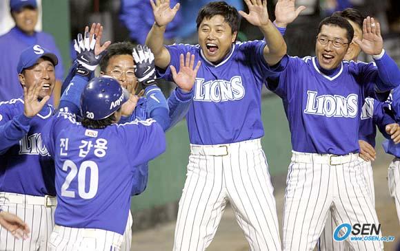 18일 잠실 구장서 벌어진 두산 베어스와 삼성 라이온즈의 한국시리즈 3차전 삼성이 4-0으로 앞서던 8회초 2사 1루서 좌측 펜스를 넘어가는 투런홈런을 치고 들어온 진갑용이 불과 몇 분 전 승부를 결정짓는 3점 홈런을 날린(오른쪽에서 두 번째) 양준혁의 환영을 받고 있다./잠실=손용호 기자 spjj@osen.co.kr [Copyright ⓒ OSEN(www.osen.co.kr) 무단전재 및 재배포 금지]