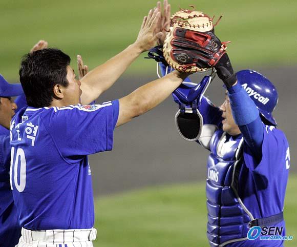 18일 잠실 구장서 벌어진 두산 베어스와 삼성 라이온즈의 한국시리즈 3차전은 양준혁과 진갑용의 홈런포로 삼성이 두산에 6-0의 완승을 거두었다. 9회말 두산의 마지막 타자 임재철을 유격수 플라이로 잡자 덕아웃에 있던 지명타자 양준혁이 달려 나와 포수 진갑용과 하이파이브를 나누고 있다./잠실=손용호 기자spjj@osen.co.kr [Copyright ⓒ OSEN(www.osen.co.kr) 무단전재 및 재배포 금지]