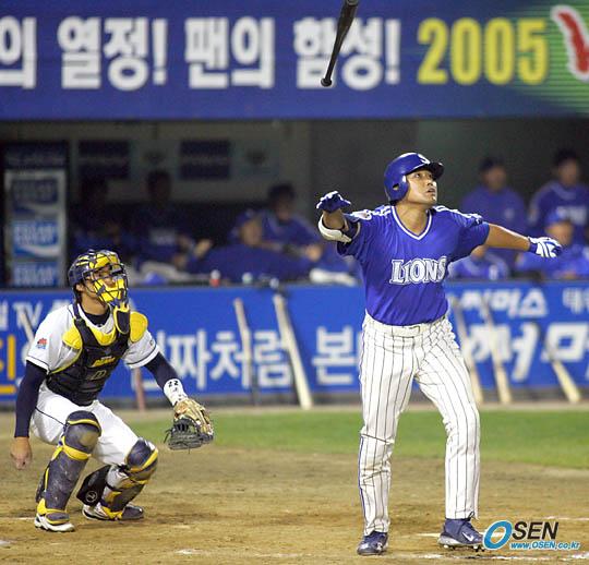 18일 잠실 구장서 벌어진 두산 베어스와 삼성 라이온즈의 한국시리즈 3차전 삼성의 8회초 2사 1,2루서 양준혁이 우측 펜스를 넘어가는 홈런을 터뜨려 4-0을 만들며 타구의 궤적을 지켜보고 있다./잠실=주지영 기자 jj0jj0@osen.co.kr [Copyright ⓒ OSEN(www.osen.co.kr) 무단전재 및 재배포 금지]