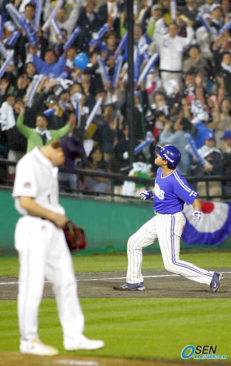 18일 잠실 구장서 벌어진 두산 베어스와 삼성 라이온즈의 한국시리즈 3차전 삼성의 8회초 2사 1,2루서 양준혁이 우측 펜스를 넘어가는 홈런을 터뜨려 4-0을 만들며 다이아몬드를 돌다 3루 앞의 삼성 응원석을 향해 어퍼컷 세리머니를 펼치고 있다. 홈런을 맞은 두산의 이재우는 마운드에서 고개를 숙이며 아쉬워하고 있다./잠실=주지영 기자 jj0jj0@osen.co.kr [Copyright ⓒ OSEN(www.osen.co.kr) 무단전재 및 재배포 금지]