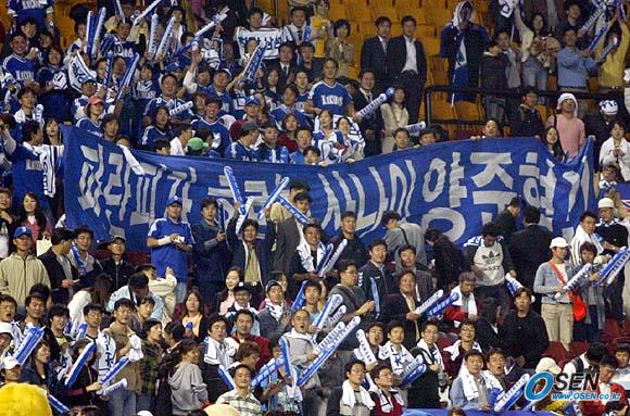 18일 잠실 구장서 벌어진 두산 베어스와 삼성 라이온즈의 한국시리즈 3차전은 양준혁과 진갑용의 홈런포로 삼성이 두산에 6-0의 완승을 거두었다. 양준혁의 3점홈런 등 홈런 두 방으로 3차전을 쉽게 이기자 팬들이 '파란피가 흐르는 사나이 양준혁'이란 플래카드를 흔들며 좋아하고 있다./잠실=손용호 기자spjj@osen.co.kr [Copyright ⓒ OSEN(www.osen.co.kr) 무단전재 및 재배포 금지]