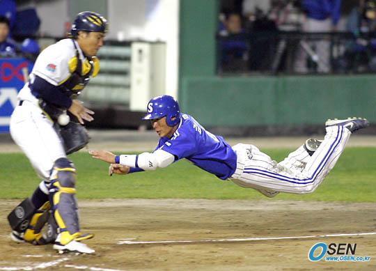 19일 잠실구장에서 벌어진 두산 베어스와 삼성 라이온즈의 한국시리즈 4차전 삼성의 3회초 1사 3루서 김종훈의 짧은 플라이 때 태그업한 3루 주자 김재걸이 홈으로 몸을 던지며 슬라이딩하고 있다. 두산 포수 홍성흔이 공을 놓쳐 세이프되었다./잠실=주지영 기자 jj0jj0@osen.co.kr [Copyright ⓒ OSEN(www.osen.co.kr) 무단전재 및 재배포 금지]