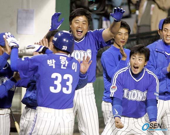 19일 잠실구장에서 벌어진 두산 베어스와 삼성 라이온즈의 한국시리즈 4차전 삼성의 3회초 2사 후 박한이가 우측 펜스를 넘어가는 솔로홈런을 날린 뒤 전날 홈런을 터뜨렸던 양준혁(가운데) 진갑용(오른쪽) 등의 환영을 받고 있다./잠실=손용호 기자 spjj@osen.co.kr [Copyright ⓒ OSEN(www.osen.co.kr) 무단전재 및 재배포 금지]