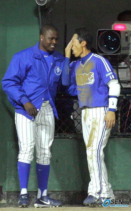 19일 잠실야구장에서 벌어진 두산 베어스와 삼성 라이온즈의 한국시리즈 4차전 삼성의 3회초 1사 3루서 김종훈의 짧은 플라이 때 태그업, 헤드퍼스트 슬라이딩으로 홈인하면서 얼굴을 그라운드 바닥에 박다시피한 김재걸이 덕아웃으로 들어온 뒤 얼굴이 아픈지 손으로 만지고 있다./잠실=주지영 기자 jj0jj0@osen.co.kr [Copyright ⓒ OSEN(www.osen.co.kr) 무단전재 및 재배포 금지]