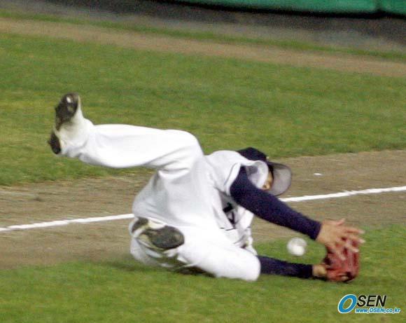 19일 잠실구장에서 벌어진 두산 베어스와 삼성 라이온즈의 한국시리즈 4차전 삼성의 4회초 2사 3루서 김재걸의 선상 타구를 두산 우익수 임재철이 끝까지 쫓아가 몸을 날렸으나 아쉽게 글러브 밑부분에 맞으며 떨어지고 있다./잠실=손용호 기자 spjj@osen.co.kr [Copyright ⓒ OSEN(www.osen.co.kr) 무단전재 및 재배포 금지]