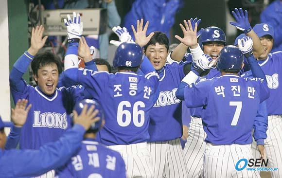 19일 잠실구장에서 벌어진 두산 베어스와 삼성 라이온즈의 한국시리즈 4차전 삼성의 8회초 2사 만루서 박한이의 잘맞은 타구를 두산 좌익수 전상렬이 다이빙캐치를 시도하다 뒤로 빠트려 세 명의 주자가 모두 홈을 밟으며 7-1이 되자 삼성 선수들이 기뻐하고 있다./잠실=손용호 기자 spjj@osen.co.kr [Copyright ⓒ OSEN(www.osen.co.kr) 무단전재 및 재배포 금지]