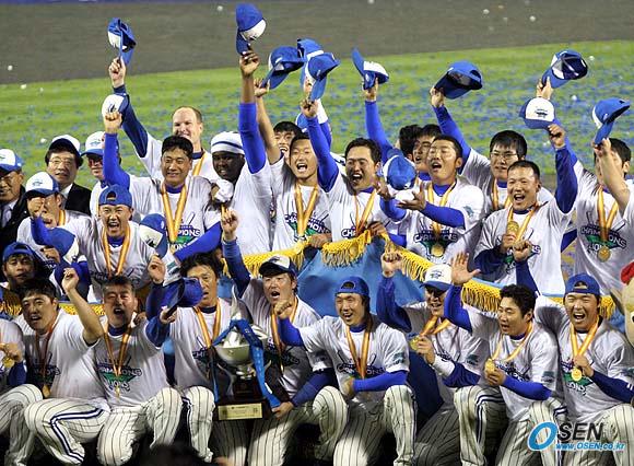 19일 잠실 구장에서 벌어진 한국시리즈 4차전서 삼성이 두산에 10-1로 대승, 4전 전승으로 우승을 차지했다. 미리 준비해 둔 우승 기념 티셔츠와 모자를 쓴 삼성 선수들이 우승컵을 앞에 놓고 환호하며 기념촬영하고 있다./잠실=손용호 기자spjj@osen.co.kr [Copyright ⓒ OSEN(www.osen.co.kr) 무단전재 및 재배포 금지]