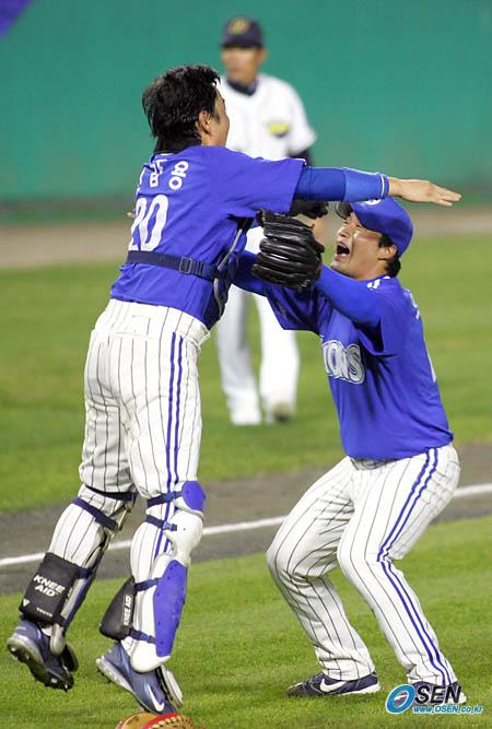 19일 잠실 구장에서 벌어진 한국시리즈 4차전서 삼성이 두산에 10-1로 대승, 4전 전승으로 우승을 차지하는 순간 마무리 오승환과 포수 진갑용이 껴안으며 좋아하고 있다./잠실=주지영 기자 jj0jj0@osen.co.kr [Copyright ⓒ OSEN(www.osen.co.kr) 무단전재 및 재배포 금지]