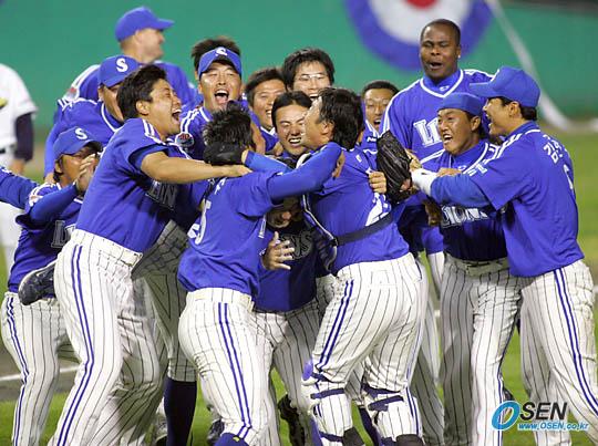 19일 잠실 구장에서 벌어진 한국시리즈 4차전서 삼성이 두산에 10-1로 대승, 4전 전승으로 우승을 차지하자 선수들이 마운드 주변으로 몰려나와 함께 환호하고 있다./잠실=주지영 기자 jj0jj0@osen.co.kr [Copyright ⓒ OSEN(www.osen.co.kr) 무단전재 및 재배포 금지]