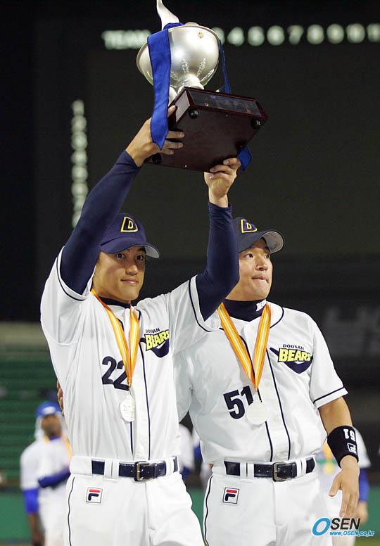 준우승 트로피를 들어보이는 홍성흔과 최경환