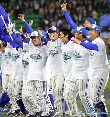 19일 잠실 구장에서 벌어진 한국시리즈 4차전서 삼성이 두산에 10-1로 대승, 4전 전승으로 우승을 차지한뒤 선수들이 어깨동무를 한 채 우승을 즐기고 있다./잠실=주지영 기자 jj0jj0@osen.co.kr [Copyright ⓒ OSEN(www.osen.co.kr) 무단전재 및 재배포 금지]