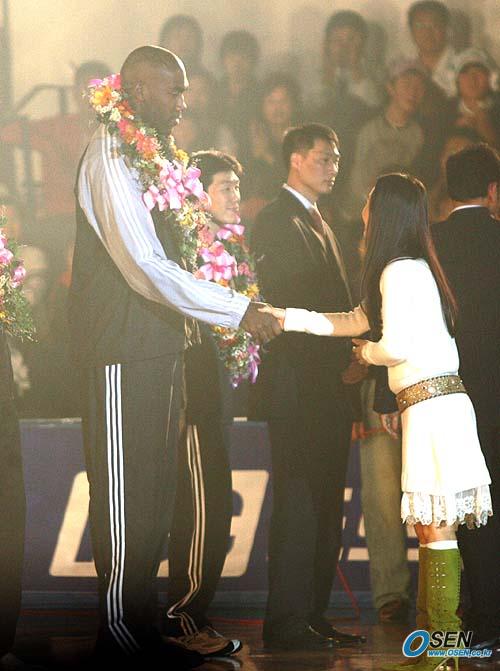 21일 원주 치악체육관에서 벌어진 동부 프로미와 대구 오리온스의 2005~2006 KCC 프로농구 개막전에 앞서 열린 동부 프로미 공식 창단식에 참석한 동부그룹 CF 모델 박주미가 왓킨스에게 꽃목걸이를 걸어 준 뒤 악수를 나누고 있다./원주=손용호 기자 spjj@osen.co.kr [Copyright ⓒ OSEN(www.osen.co.kr) 무단전재 및 재배포 금지]