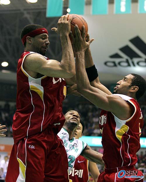 21일 원주 치악체육관에서 벌어진 동부 프로미와 대구 오리온스의 2005~2006 KCC 프로농구 개막전 3쿼터서 오리온스의 새 용병 안드레 브라운(왼쪽, 201cm)와 아이라 클라크(195cm)가 동부 골밑에서 동시에 공격 리바운드를 잡고 있다./원주=손용호 기자 spjj@osen.co.kr [Copyright ⓒ OSEN(www.osen.co.kr) 무단전재 및 재배포 금지]
