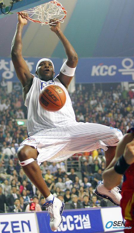 22일 전주 실내체육관에서 벌어진 전주 KCC와 울산 모비스의 경기서 육중한 체구(203cm, 138kg)의 KCC 새 용병 쉐런 라이트가 투핸드 덩크슛을 꽂은 뒤 림에 매달려 있다./전주=주지영 기자 jj0jj0@osen.co.kr [Copyright ⓒ OSEN(www.osen.co.kr) 무단전재 및 재배포 금지]