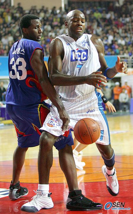 22일 전주 실내체육관에서 벌어진 전주 KCC와 울산 모비스의 경기서 KCC의 찰스 민렌드(오른쪽,194cm)가 모비스의 새 용병 크리스 윌리엄스(193cm)에게 다리가 걸려 공을 놓치고 있다./전주=주지영 기자 jj0jj0@osen.co.kr [Copyright ⓒ OSEN(www.osen.co.kr) 무단전재 및 재배포 금지]