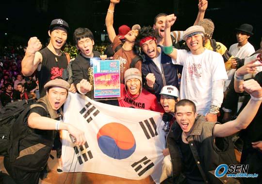 23일 독일 하노버에서 열린 브레이크 댄스팀(B-보이) 세계 대회인 '배틀 오프 더 이어 2005'에서 우승한 한국의 이 1위를 차지한 뒤 태극기를 흔들며 기념 촬영하고 있다. 19개 팀이 참가한 이번 대회서 2위는 일본, 3위는 프랑스 팀이 차지했고 작년 우승팀으로 자동 출전권을 가진 한국의 는 4위에 그쳤다./하노버=PNP 스튜디오 이상신 객원기자 [Copyright ⓒ OSEN(www.osen.co.kr) 무단전재 및 재배포 금지]