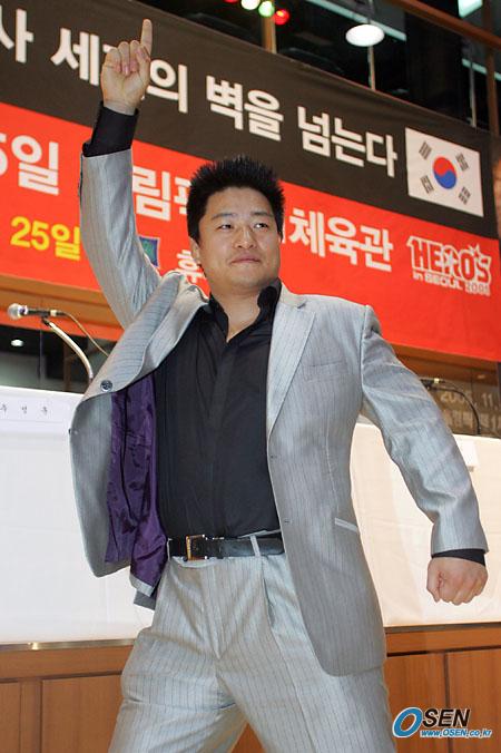 25일 오후 서울 역삼동 스타타워의 휴레스트에서 최무배가 프라이드서 K-1으로 전향하는 조인식을 가진 뒤 카메라 맨들을 위해 특유의 디스코 춤 포즈를 취하고 있다./주지영 기자 jj0jj0@osen.co.kr [Copyright ⓒ OSEN(www.osen.co.kr) 무단전재 및 재배포 금지]