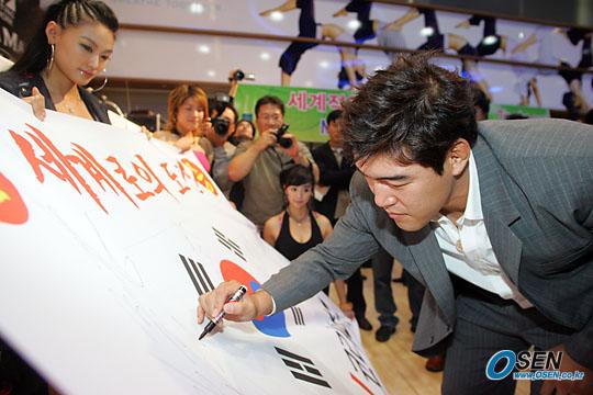 25일 오후 서울 역삼동 스타타워의 휴레스트에서 오는 11월 5일 올림픽공원 체조경기장에서 벌어질 K-1 히어로스 대회에 출전할 한국 선수들의 기자회견이 끝난 뒤 김민수가 태극기에 사인하며 승리를 다짐하고 있다./주지영 기자 jj0jj0@osen.co.kr [Copyright ⓒ OSEN(www.osen.co.kr) 무단전재 및 재배포 금지]