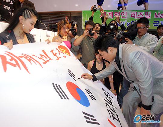 25일 오후 서울 역삼동 스타타워의 휴레스트에서 오는 11월 5일 올림픽공원 체조경기장에서 벌어질 K-1 히어로스 대회에 출전할 한국 선수들의 기자회견이 끝난 뒤 이날 프라이드서 K-1으로 전향하는 조인식을 가진 최무배가 태극기에 사인하며 승리를 다짐하고 있다./주지영 기자 jj0jj0@osen.co.kr [Copyright ⓒ OSEN(www.osen.co.kr) 무단전재 및 재배포 금지]
