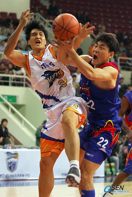리바운드 볼을 다투는 이창수와 윤영필
