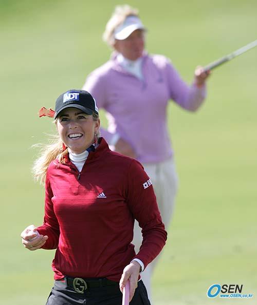 29일 제주의 CJ 나인브릿지 골프코스에서 열린 미LPGA투어 CJ 나인브릿지클래식 대회 2라운드 15번홀서 폴라 크리머가 퍼팅을 하는 순간 11번홀에서 티샷을 한 공이 15번 퍼팅그린까지 날아오자 깜짝 놀라 웃고 있다. 11번과 15번홀은 퍼팅 그린이 붙어있다./제주=손용호 기자 spjj@osen.co,kr [Copyright ⓒ OSEN(www.osen.co.kr) 무단전재 및 재배포 금지]