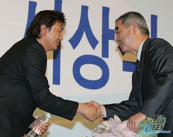 31일 서울 소공동 프라자 호텔에서 2005 삼성파브 프로야구 최우수선수 및 신인왕 투표와 각 부문별 시상식이 열려 손민한이 최우수선수, 오승환이 신인왕을 차지했다. 강병철 롯데 신임 감독(오른쪽)이 MVP를 수상한 손민한을 축하해 주고 있다./손용호 기자 spjj@osen.co.kr [Copyright ⓒ OSEN(www.osen.co.kr) 무단전재 및 재배포 금지]