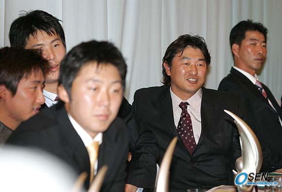 31일 서울 소공동 프라자 호텔에서 2005 삼성파브 프로야구 최우수선수 및 신인왕 투표와 각 부문별 시상식이 열려 손민한이 최우수선수, 오승환이 신인왕을 차지했다. 개표가 우세하게 전개되자 손민한(오른쪽에서 두 번째)이 웃으며 결과를 지켜보고 있다./손용호 기자 spjj@osen.co.kr [Copyright ⓒ OSEN(www.osen.co.kr) 무단전재 및 재배포 금지]