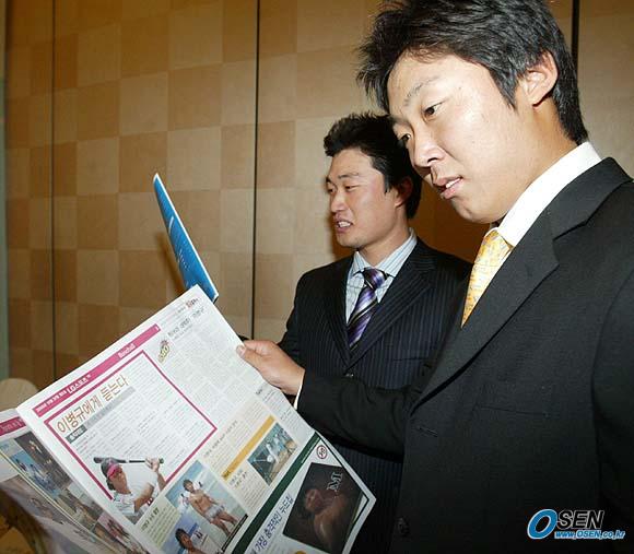 31일 서울 소공동 프라자 호텔에서 2005 삼성파브 프로야구 최우수선수 및 신인왕 투표와 각 부문별 시상식이 열려 손민한이 최우수선수, 오승환이 신인왕을 차지했다. 투표에 앞서 배영수가 LG 구단에서 MVP 후보 이병규를 위해 만든 홍보지를 보고 있다./손용호 기자 spjj@osen.co.kr [Copyright ⓒ OSEN(www.osen.co.kr) 무단전재 및 재배포 금지]