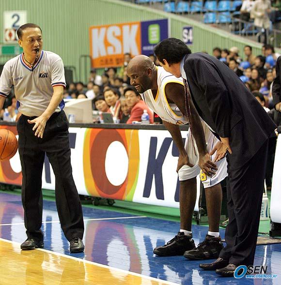 1일 잠실체육관에서 벌어진 2005~2006 KCC 프로농구 서울 삼성과 안양 KT&G의 경기 4쿼터서 삼성의 네이트 존슨이 골밑을 파고들 때 주심이 휘슬을 불어 KT&G의 파울을 선언하자 주심에게 항의했으나 받아들여지지 않자 김동광 감독이 상대 선수인 네이트 존슨에게 직접 가서 물어보고 있다./잠실체=손용호 기자 spjj@osen.co.kr [Copyright ⓒ OSEN(www.osen.co.kr) 무단전재 및 재배포 금지]