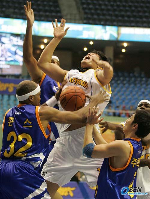1일 잠실체육관에서 벌어진 2005~2006 KCC 프로농구 서울 삼성과 안양 KT&G의 경기 3쿼터서 삼성의 서장훈(가운데)이 가이 루커, 단테 존스, 주희정 등 KT&G 선수 3명의 집중 마크에 볼을 놓치며 괴로운 동작을 취하고 있다./잠실체=손용호 기자 spjj@osen.co.kr [Copyright ⓒ OSEN(www.osen.co.kr) 무단전재 및 재배포 금지]