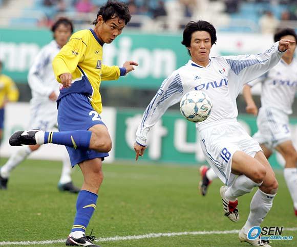 2일 파주 공설운동장에서 벌어진 2005 하나은행 FA컵 수원 삼성과 성남 일화의 16강전 후반 0-2로 뒤지던 성남의 우성용이 오른발 강슛을 날리고 있다. 수원 골키퍼 이운재가 가까스로 잡았지만 볼이 골라인을 넘어선 것으로 판정돼 득점이 선언됐다./파주=손용호 기자 spjj@osen.co.kr [Copyright ⓒ OSEN(www.osen.co.kr) 무단전재 및 재배포 금지]