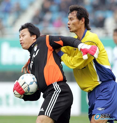 2일 파주 공설운동장에서 벌어진 2005 하나은행 FA컵 수원 삼성과 성남 일화의 16강전 후반 우성용의 슈팅을 가까스로 잡은 이운재가 볼이 골 라인을 넘어갔다는 판정에 항의하러 달려가자 뒤에서 우성용이 붙잡고 있다./파주=손용호 기자 spjj@osen.co.kr [Copyright ⓒ OSEN(www.osen.co.kr) 무단전재 및 재배포 금지]