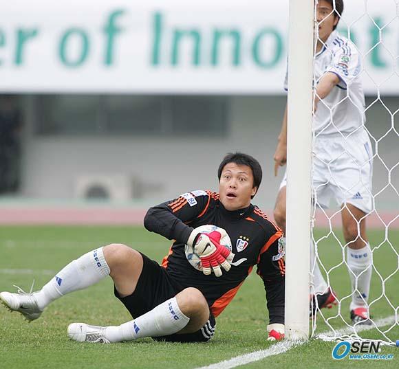 2일 파주 공설운동장에서 벌어진 2005 하나은행 FA컵 수원 삼성과 성남 일화의 16강전 후반 성남 우성용의 슈팅을 가까스로 잡은 수원 골키퍼 이운재가 볼이 골 라인을 넘어갔다는 선심의 판정에 눈을 크게 뜨고 골라인을 넘기 전에 잡았다며 소리치고 있다./파주=손용호 기자 spjj@osen.co.kr [Copyright ⓒ OSEN(www.osen.co.kr) 무단전재 및 재배포 금지]