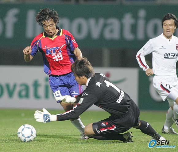 2일 파주 공설운동장에서 벌어진 2005 하나은행 FA컵 부천 SK와 인천 한국철도의 16강전서 한국철도가 부천에 4-2로 승리, 또 하나의 이변을 연출했다. 한국철도 고명권의 드리블이 길어 부천 골키퍼 최현이 먼저 잡아내고 있다./파주=손용호 기자 spjj@osen.co.kr [Copyright ⓒ OSEN(www.osen.co.kr) 무단전재 및 재배포 금지]