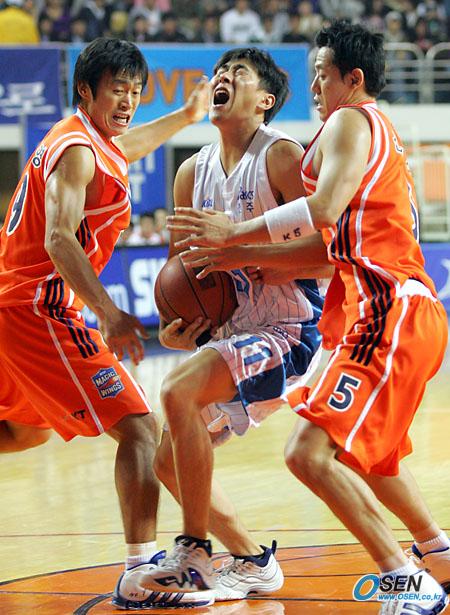 2일 전주 실내체육관에서 벌어진 2005~2006 KCC 프로농구 전주 KCC와 부산 KTF의 경기서 KCC의 이상민(가운데)이 KTF의 정낙영(왼쪽)과 신기성의 마크에 걸리고 있다./전주=주지영 기자 jj0jj0@osen.co.kr [Copyright ⓒ OSEN(www.osen.co.kr) 무단전재 및 재배포 금지]