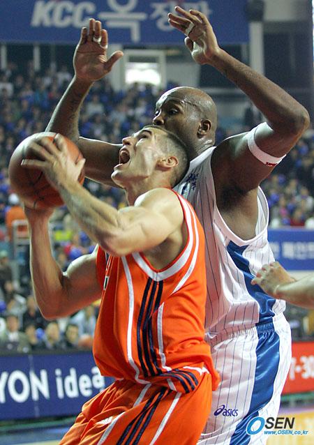2일 전주 실내체육관에서 벌어진 2005~2006 KCC 프로농구 전주 KCC와 부산 KTF의 경기서 KTF의 샐리어스(왼쪽)가 골밑슛을 하려다 뒤에서 막고 있는 138kg의 거구 라이트에 막혀 슛을 던지지 못하고 있다./전주=주지영 기자 jj0jj0@osen.co.kr [Copyright ⓒ OSEN(www.osen.co.kr) 무단전재 및 재배포 금지]
