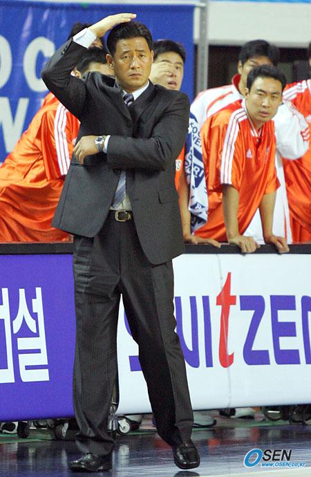 2일 전주 실내체육관에서 벌어진 2005~2006 KCC 프로농구 전주 KCC와 부산 KTF의 경기서 KTF의 추일승 감독이 오른손을 머리 위로 올리며 작전 사인을 내고 있다. /전주=주지영 기자 jj0jj0@osen.co.kr [Copyright ⓒ OSEN(www.osen.co.kr) 무단전재 및 재배포 금지]