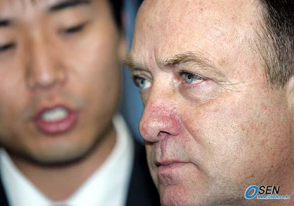 딕 아드보카트 축구대표팀 감독이 유럽파 선수들의 경기 관전 및 전지훈련 준비 출장을 마치고 4일 네덜란드항공편으로 귀국했다. 귀국 인터뷰에서 아드보카트 감독이 통역 박일기 씨를 통해 기자들의 질문 내용을 전달받고 있다./인천공항=손용호 기자 spjj@osen.co.kr [Copyright ⓒ OSEN(www.osen.co.kr) 무단전재 및 재배포 금지]